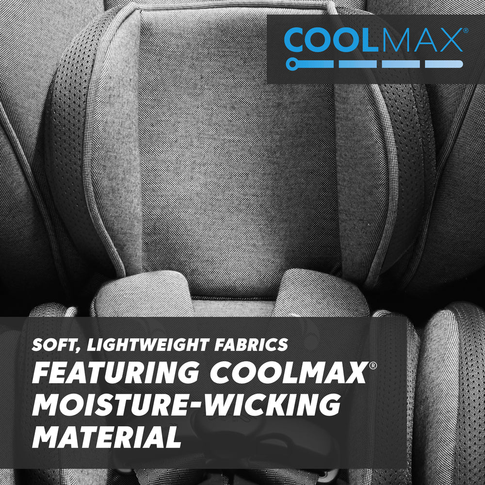 - Comfort is ensured with premium padding, a 10 position headrest, a removable infant insert for newborns, buckle covers, and soft, lightweight fabrics featuring coolmax® moisture wicking material